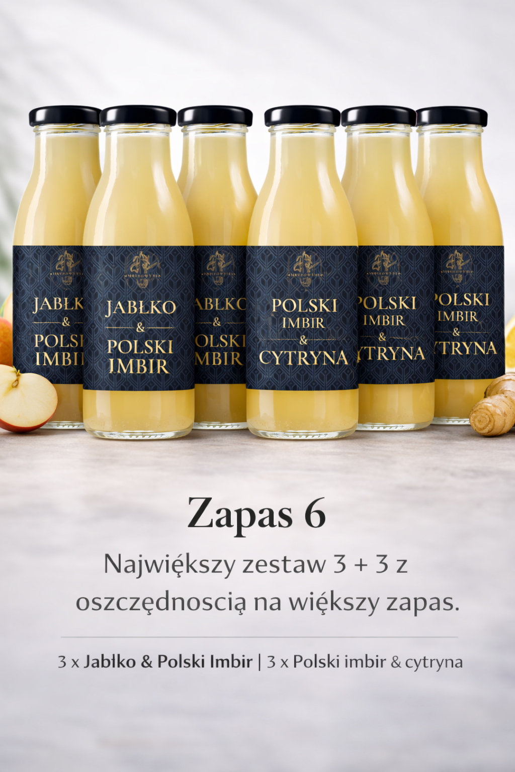 Zapas 6 to największy zestaw w ofercie Imbirowy.pl, przygotowany dla osób, które chcą mieć pod ręką oba warianty i kupować bardziej praktycznie. W komplecie znajdują się 3 butelki Jabłko & Polski Imbir oraz 3 butelki Polski imbir & cytryna, dzięki czemu możesz sięgać zarówno po łagodniejszy profil z jabłkiem, jak i po bardziej wyrazisty wariant z cytryną. To wygodny wybór do domu, dla dwóch osób lub dla klientów, którzy już poznali markę i chcą zrobić większy zapas w jednej, lepiej uporządkowanej ofercie.